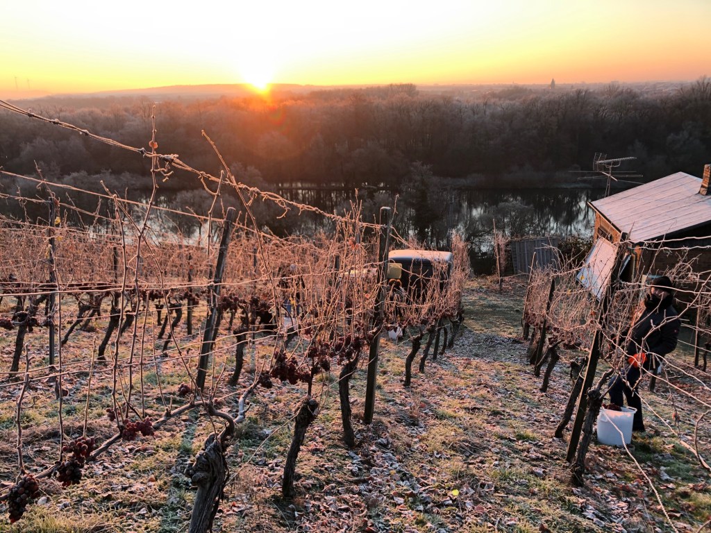 Il 30 novembre dalle ore 5 del mattino 400 viti sono state vendemmiate a temperature gelide nel vigneto Sehndorfer Marienberg: soltanto 120 litri di mosto che ora deve riposare per due giorni prima di essere travasato nelle botti a fermentare per circa sei mesi. L’Eiswein sarà in vendita a partire dal 2022.