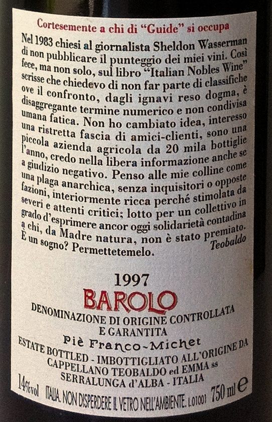 Proprio nella retro-etichetta di questo vino troviamo quello che ancora oggi può essere considerato il manifesto del contadino libero o come direbbe Wendell Berry del “mad farmer”. Ma, soprattutto, la “Controetichetta” di Teobaldo Cappellano vuole invitare alla riflessione, perché “in un mondo in cui le persone non sono più abituate a pensare” i giudizi netti, sintetici e asettici, indipendentemente dal loro essere positivi o negativi, possono essere pericolosi.