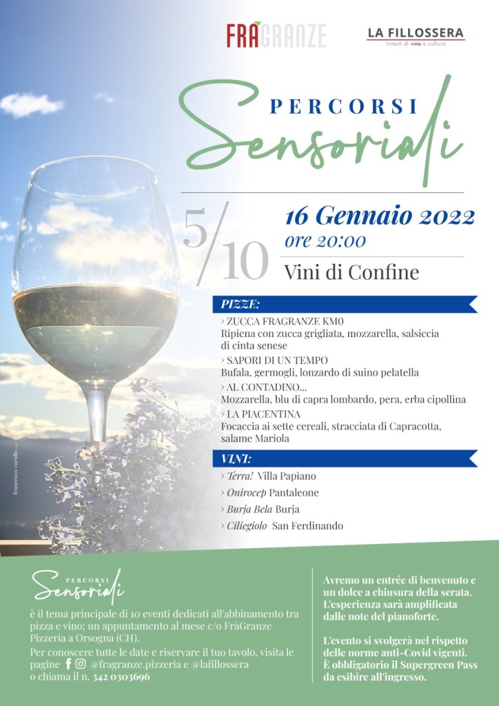 Domenica 16 gennaio quinto appuntamento con “Percorsi Sensoriali: abbinamento pizza e vino”. Protagonisti della serata vitigni e vini “di confine” in abbinamento a quattro pizze create da Francesco Pace di Fràgranze Pizzeria.