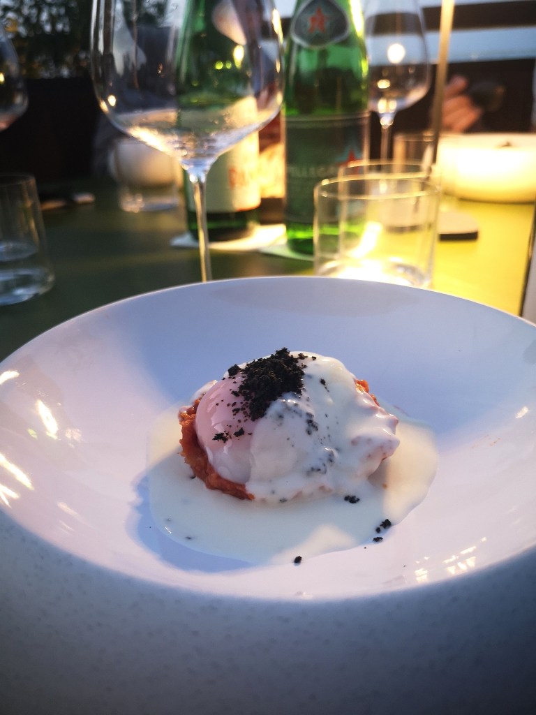 Uovo cbt con pappa al pomodoro, colatura di caciocavallo Silano e polvere di olive