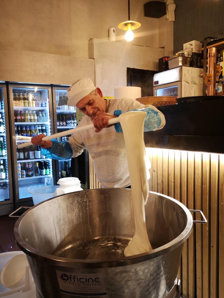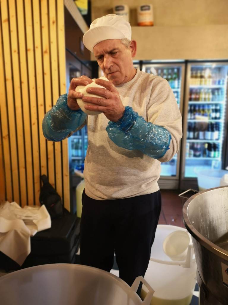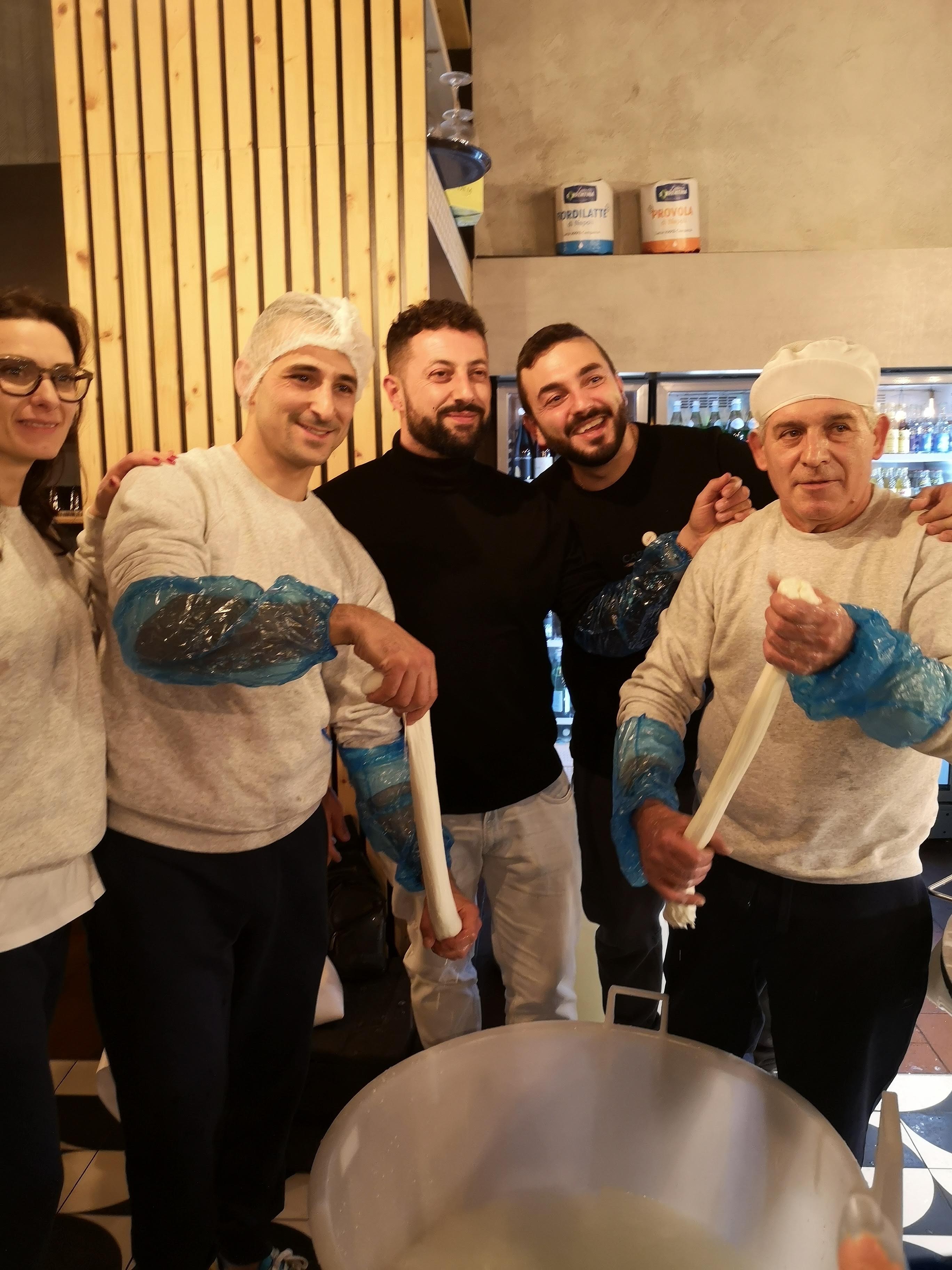 Durante la serata, Fulvio e Antonella hanno presentato il loro mastro casaro Paolo Gallo che, con 45 anni di esperienza alle spalle, ha filato live in pizzeria prima il caciocavallo di latte di mucca e poi filato e mozzato la mozzarella di latte di bufala 100% abruzzese, che abbiamo potuto degustare freschissima.