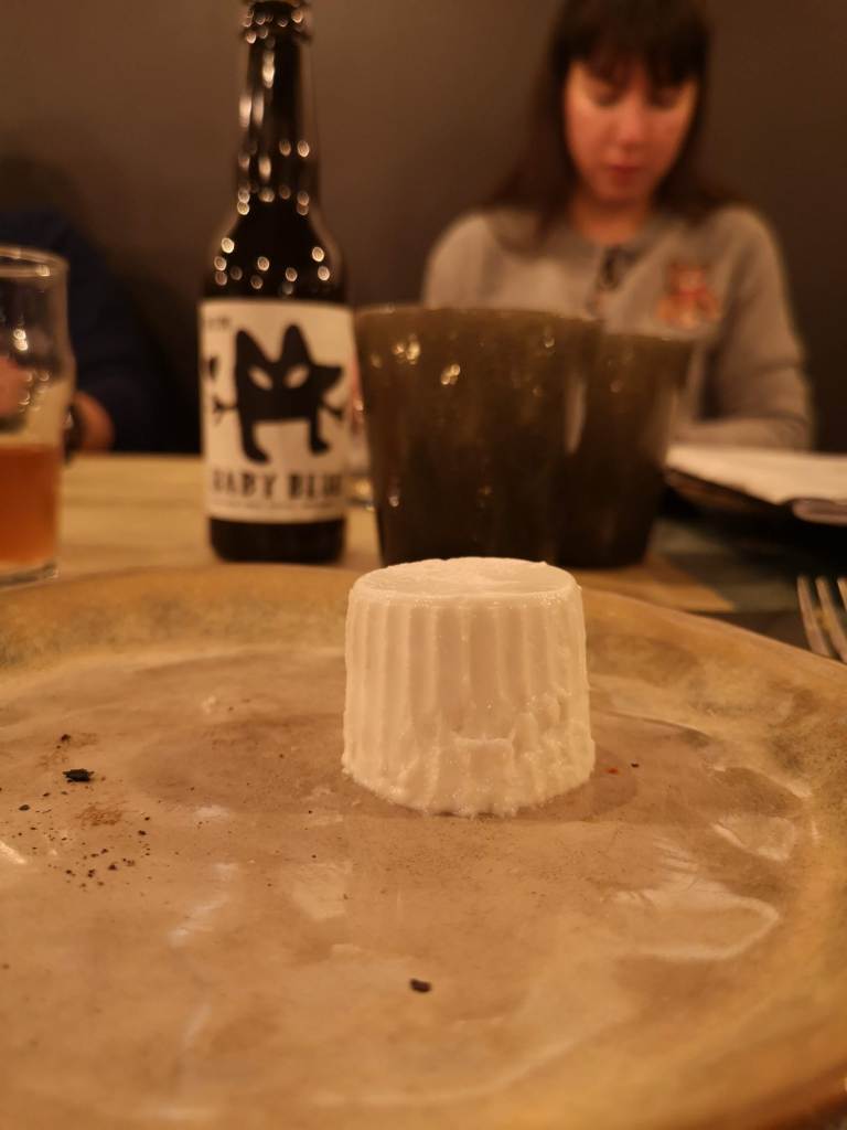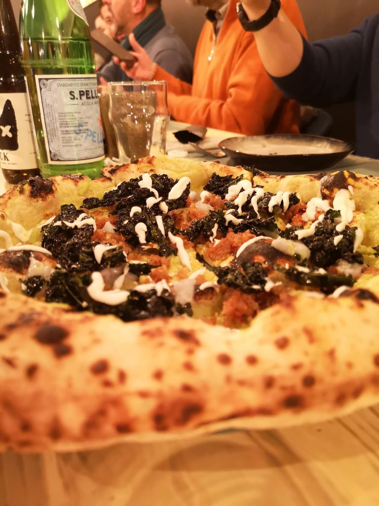 Emilio ha proposto per la serata una degustazione di: crocchè di patate con ventricina teramana, una ricotta di bufala prodotta e affumicata da Sant’Agata, una pizza ai tre formaggi di bufala e noci pecan e una pizza con cavolo nero croccante, cavolo viola, cavolo verde, salsiccia di cotechino e crema di ricotta di bufala. Per concludere il panettone classico e quello con pistacchio sempre realizzati da Emilio.